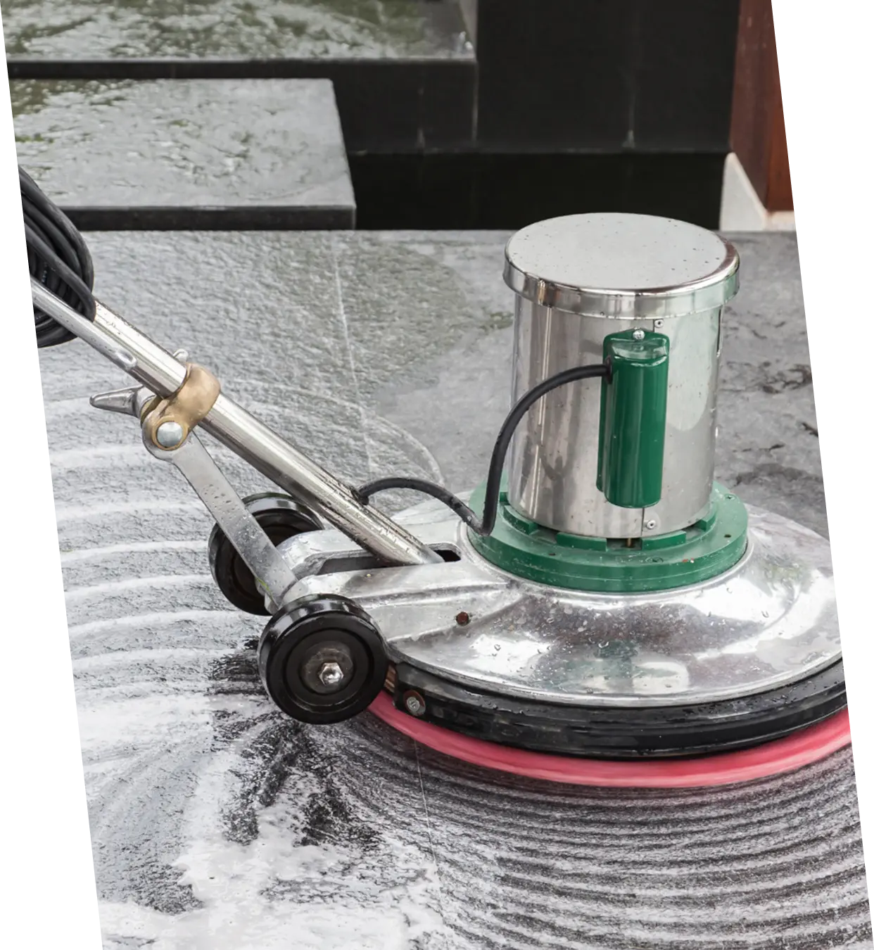Koristimo profesionalne mašine sa rotacionim četkama i usisom, koje temeljno peru i istovremeno usisavaju prljavu vodu – pod je čist i gotovo suv odmah nakon pranja.